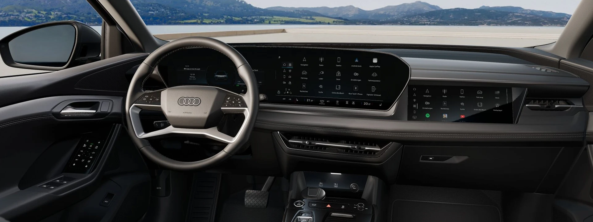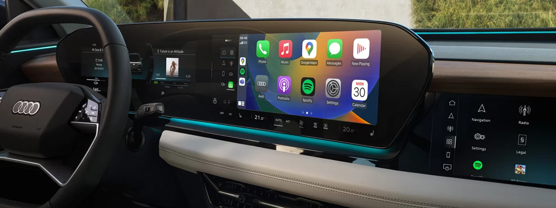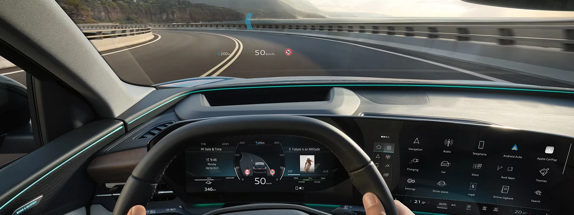 O Audi Virtual Cockpit Plus exibe as informações de condução mais importantes em uma das três variantes de layout, com operação personalizável, navegação de menu intuitiva e display orientado à direção.