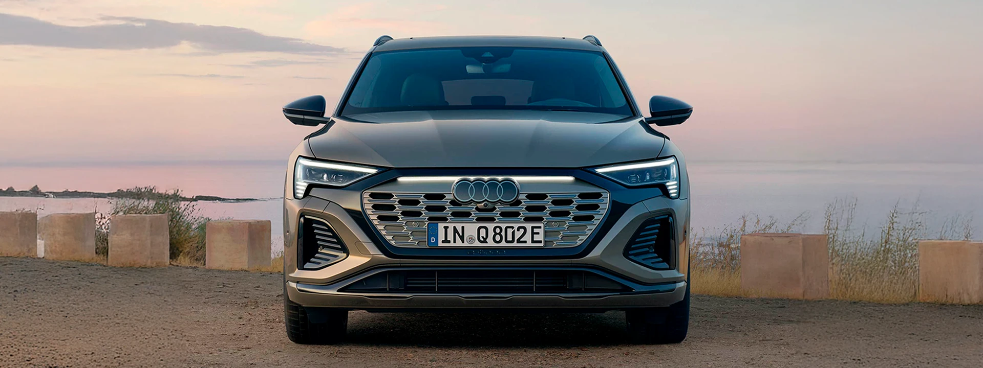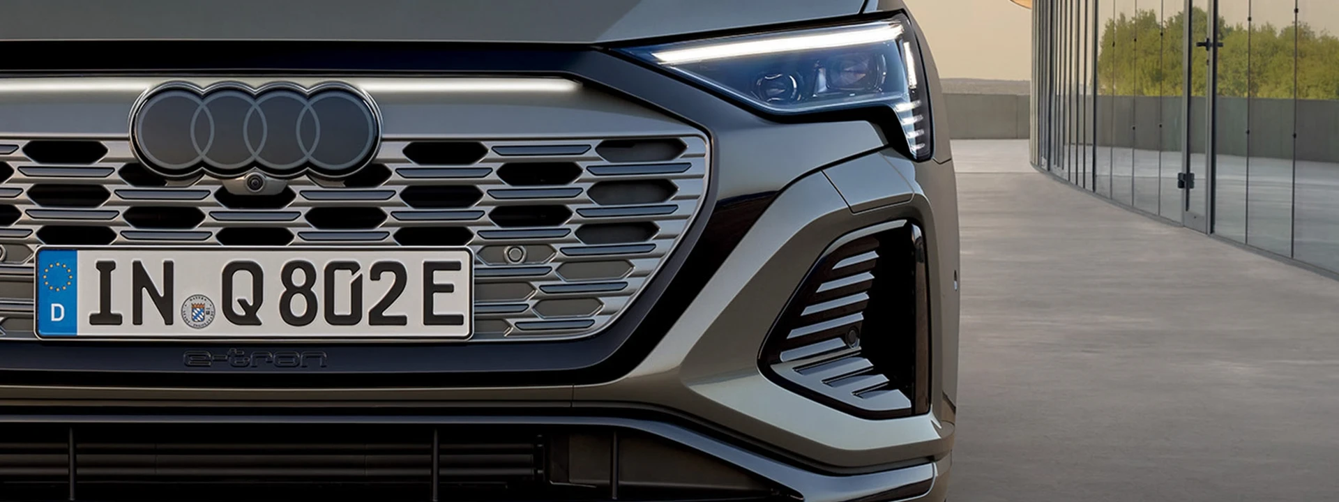 O Audi Q8 e-tron mostra o caminho a seguir para a mobilidade elétrica pioneira: com os detalhes progressivos da nova estratégia de emblemas da Audi, como, por exemplo, os anéis Audi em aparência 2D, um design frontal modificado e a nova grade Singleframe iluminada.