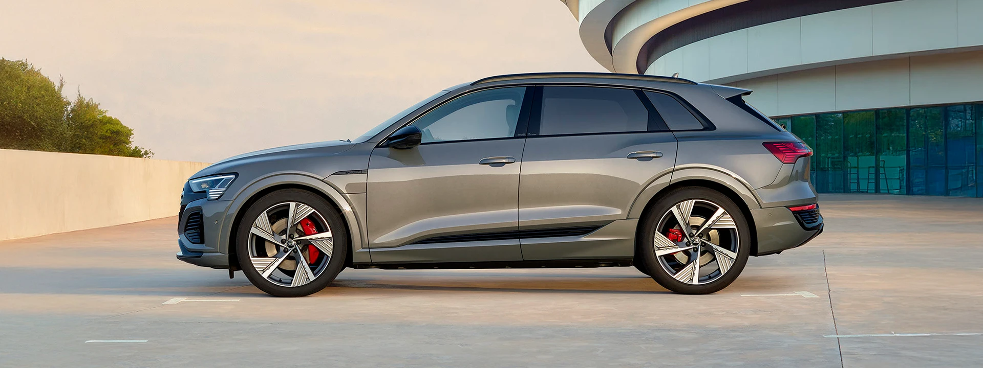 Detalhes como o nome do modelo gravado a laser no pilar B, os anéis Audi em um novo visual e os logotipos e-tron são uma expressão da linguagem de design em constante evolução.