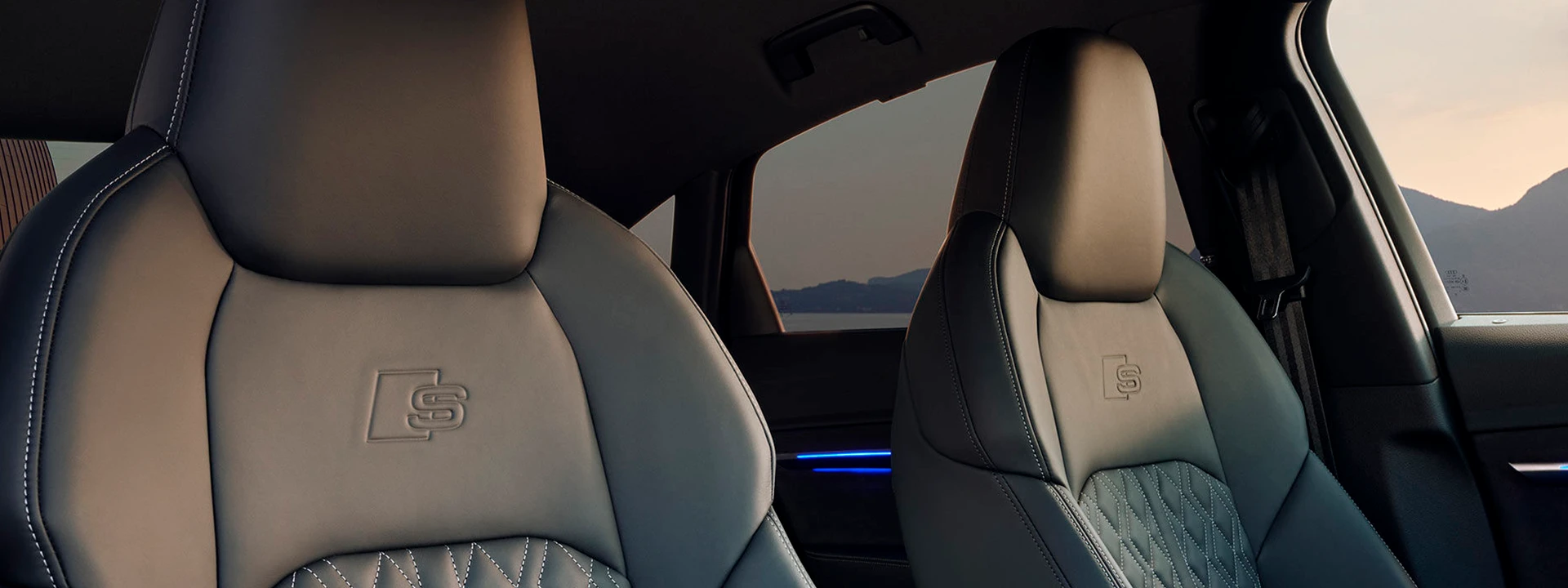O consistente caráter esportivo é visível no interior. Os bancos dianteiros esportivos em couro Valcona, preto com padrões em losango e o S gravado em relevo define o ambiente. Os estofados dos bancos com costuras contrastantes em cinza rocha chamam ainda mais a atenção.
